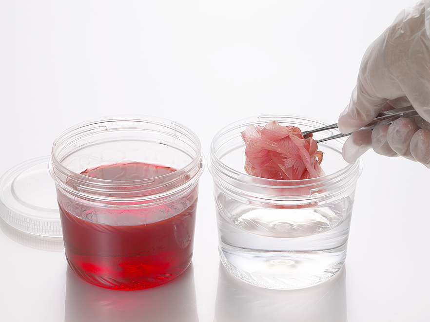 Step6で十分染まったお花をA液でさっとすすぎます。すすぎの時間は1秒から10秒まで。
